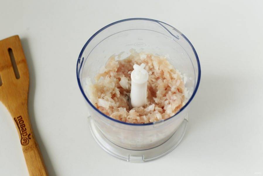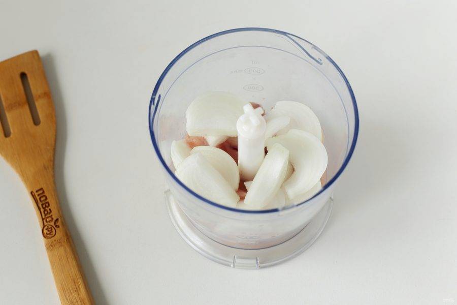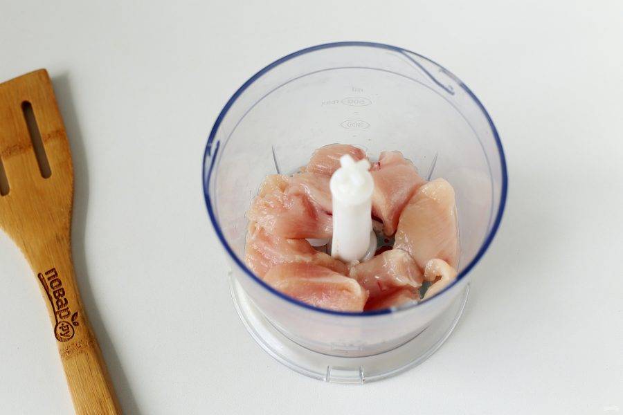 Куриное филе нарежьте кусочками и сложите в чашу блендера.