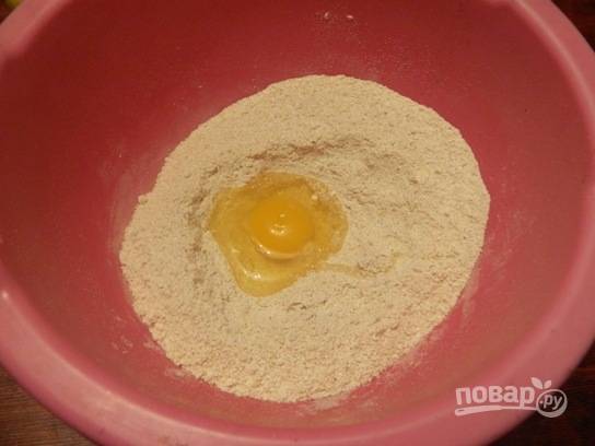 Муку насыпаем в глубокую миску, делаем в ней углубление и вбиваем 1 яйцо.