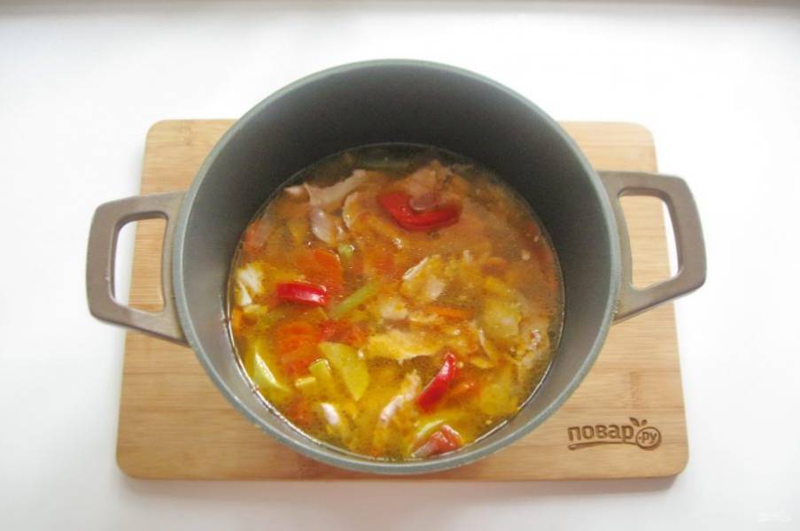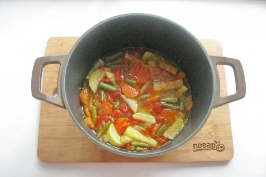 Налейте в казан 300-350 мл. куриного бульона. Посолите по вкусу и тушите овощи до готовности 20-25 минут.