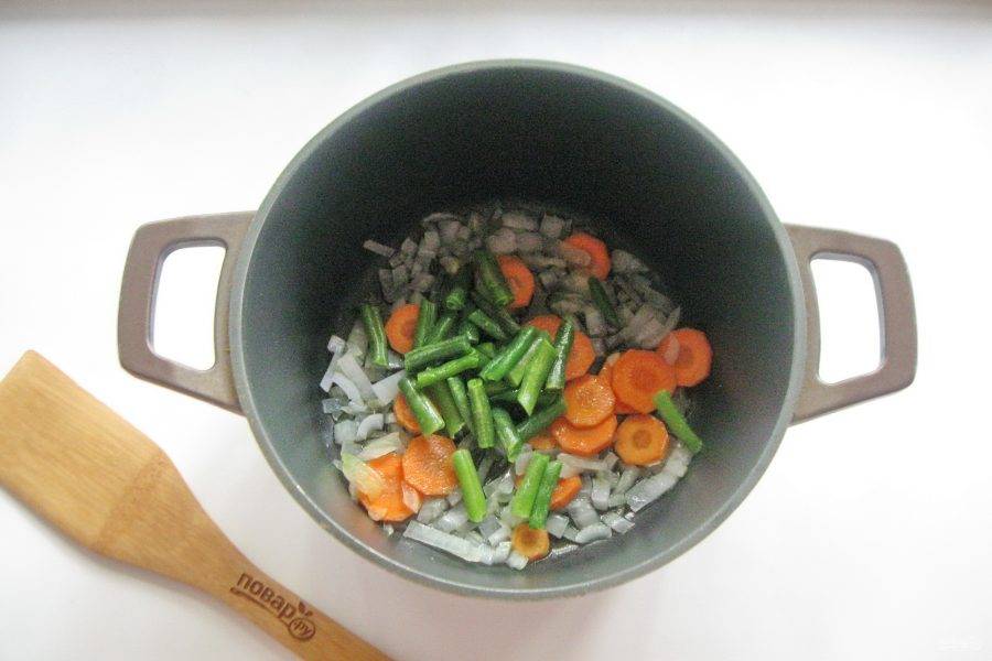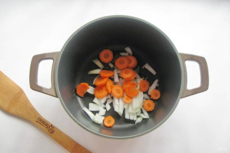 Лук и морковь очистите, помойте и нарежьте произвольно. Выложите в казан. Слегка поджарьте в течение 8-10 минут, но сильно зажаривать не нужно.