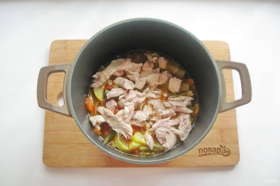 У вареного окорочка удалите кости и шкурку. А мякоть нарежьте кусочками, но не очень мелко. Добавьте в казан с овощами.