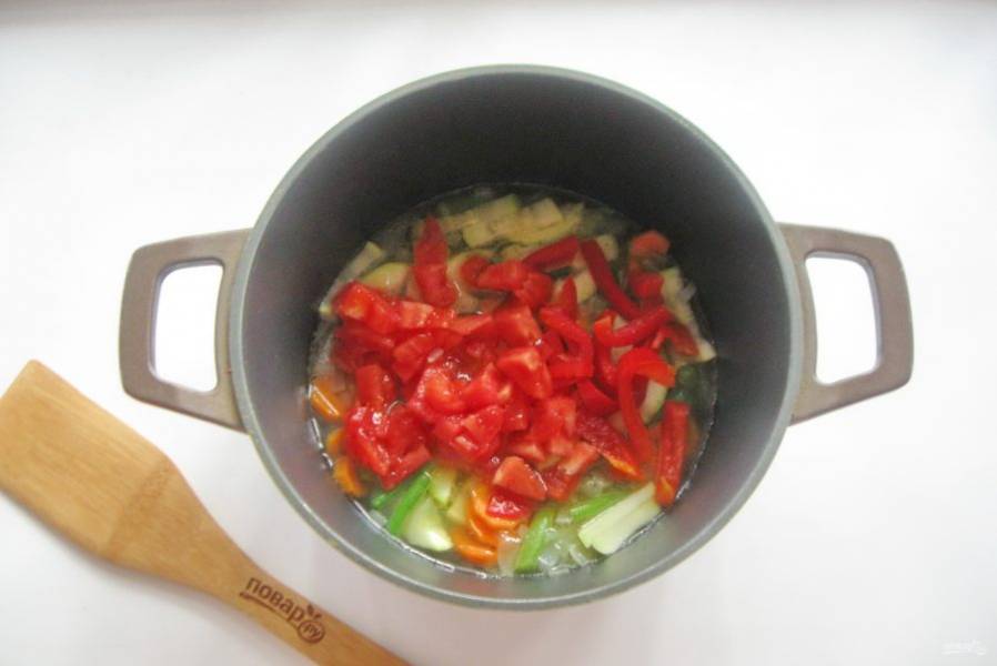 Помидоры помойте, нарежьте и выложите в казан к остальным овощам. Можно предварительно обдать помидоры кипятком и снять кожицу.