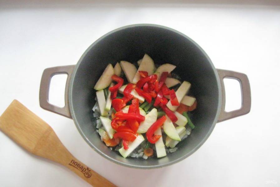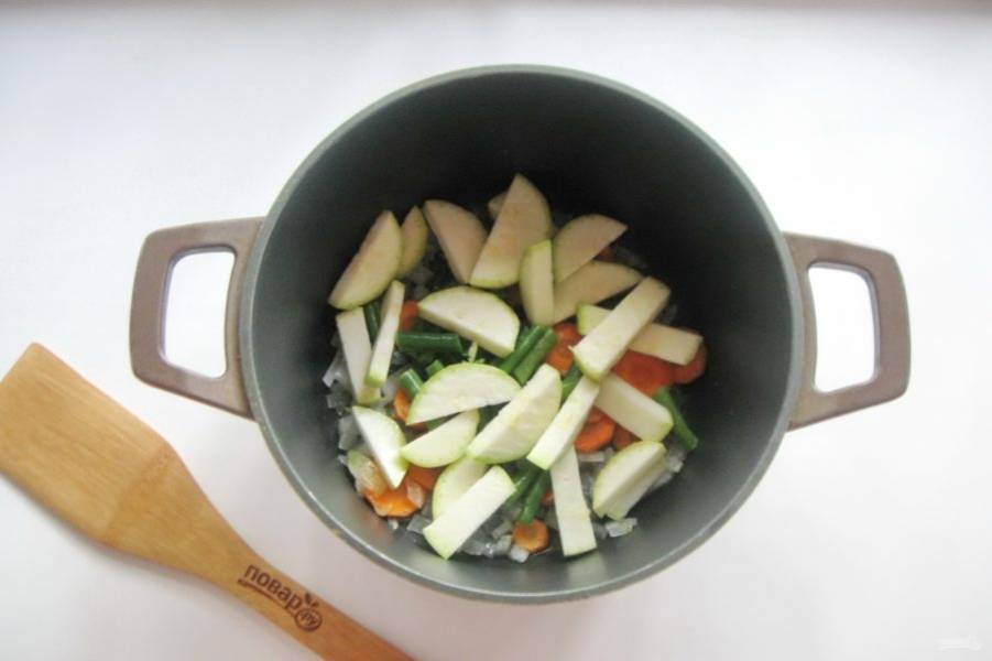 Кабачок помойте, очистите. Молодой можно не чистить. Нарежьте кабачок произвольно и добавьте в казан.