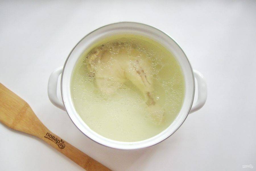 Куриный окорочок помойте и залейте водой. Доведите до кипения, огонь убавьте до минимума и снимите пену. Варите курицу до готовности.