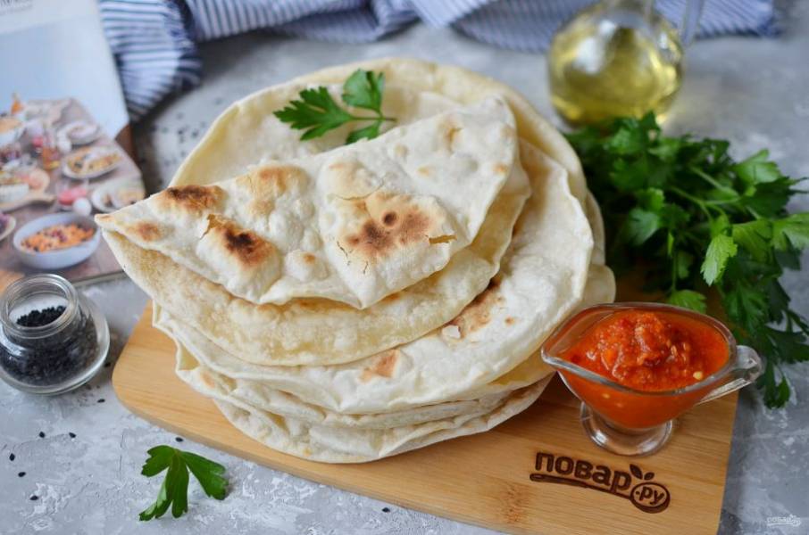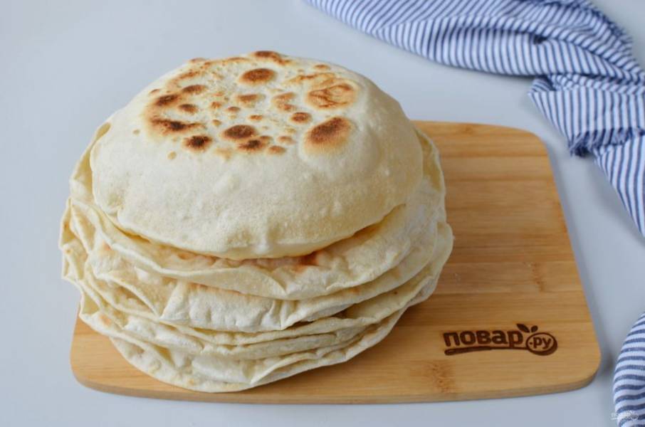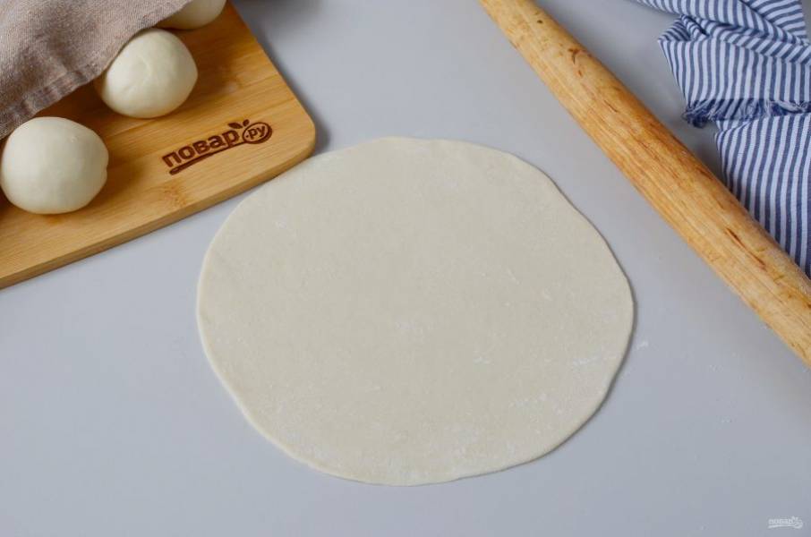 Поставьте сковороду на средний огонь. Раскатайте на подпыленном столе один кусочек теста в круг. Диаметр моей сковороды 24 см., поэтому я подгоняла лаваши под этот размер.