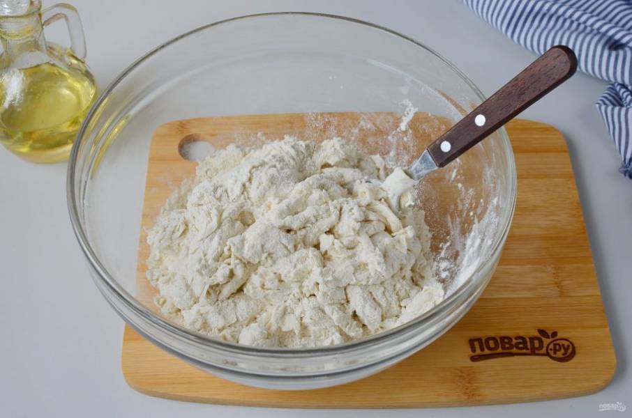 Начните быстро ложкой замешивать тесто. Когда станет уже сложно это делать, переложите на стол и замесите плотный колобок.