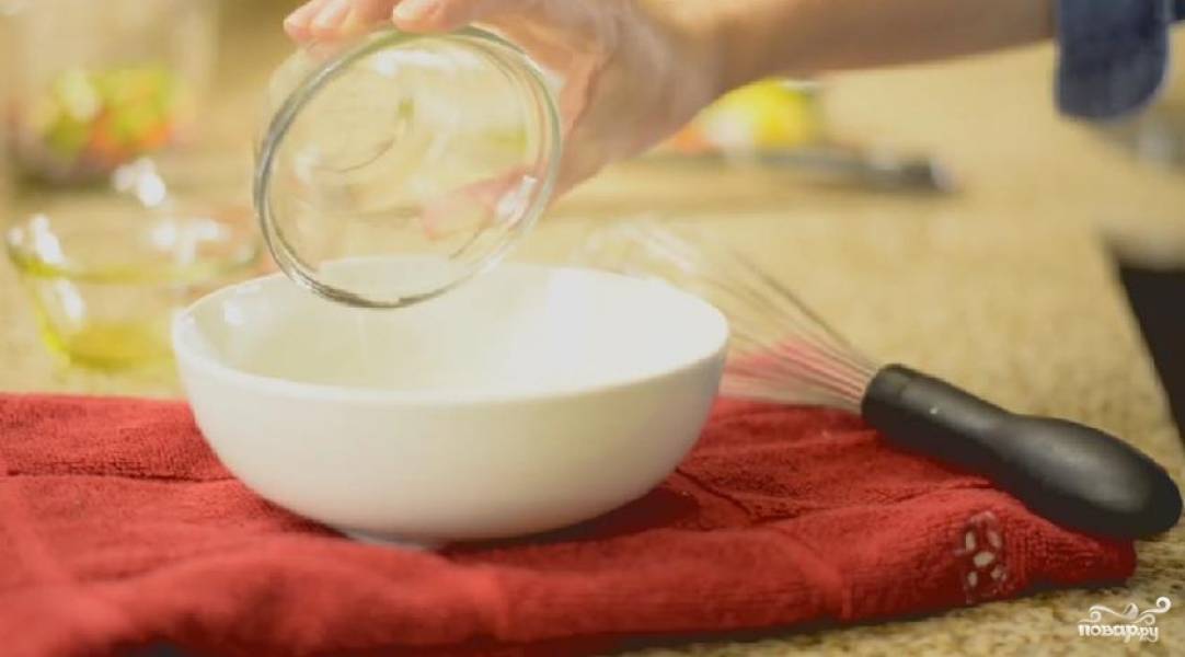 Пока варится чечевица, займитесь соусом и другими ингредиентами. Смешайте оливковое масло, лимонный сок и винный уксус. Добавьте мелко нарезанный чеснок. Тщательно перемешайте при помощи венчика.