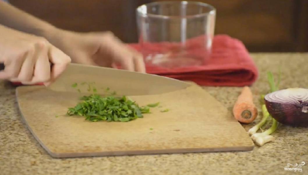 Мелко покрошите зеленый и красный лук. Кубиками нарежьте сырую морковь. Также крошим петрушку.