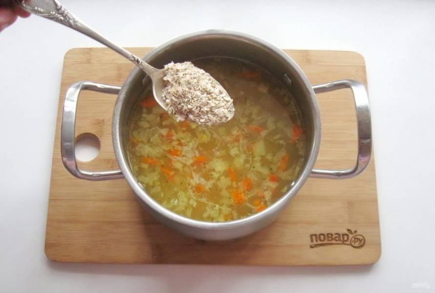 Когда картофель, лук и морковь будут практически готовы, добавьте в суп овсяные хлопья быстрого приготовления. Посолите суп по вкусу и варите еще 7-8 минут.