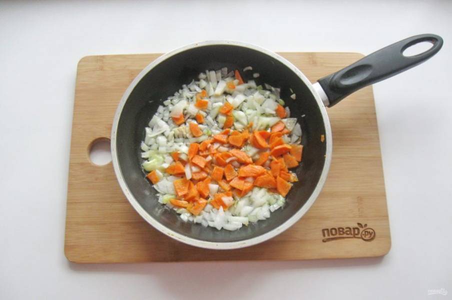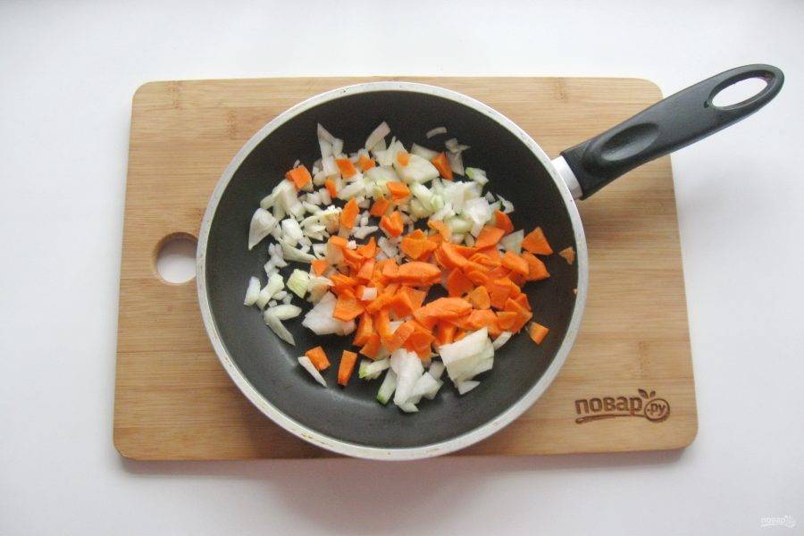 Лук и морковь очистите, помойте и мелко нарежьте. Выложите в сковороду.