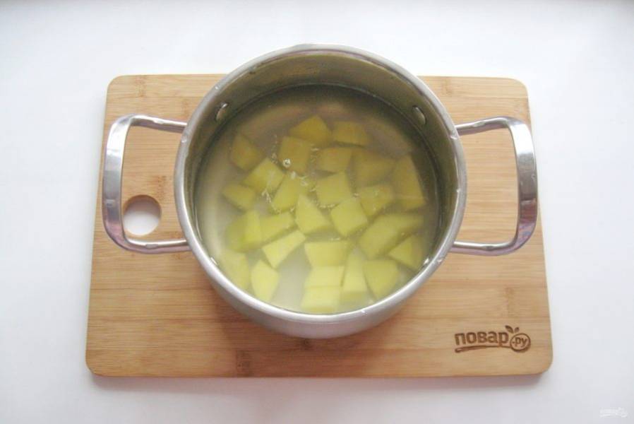 Картофель очистите, помойте и нарежьте кубиками. Выложите в бульон.