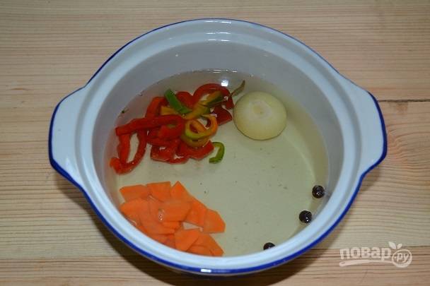 5. Кипящую воду чуть посолите, отправьте туда морковь и перец. Проварите около 5 минут.