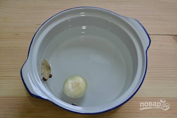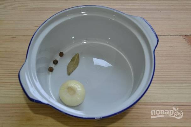 2. В кастрюльку отправляем очищенную луковицу, лавровый лист и душистый перец.