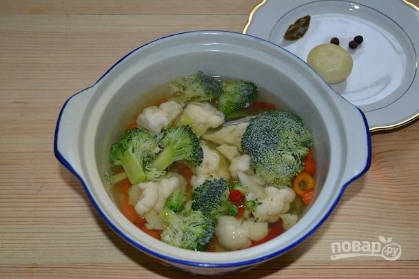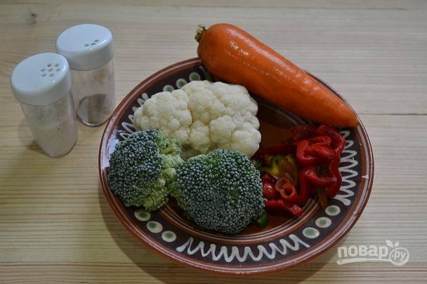 4. Тем временем можно заняться овощами. Очистите морковь и сладкий перец, измельчите. Разделите на маленькие кусочки брокколи и цветную капусту.