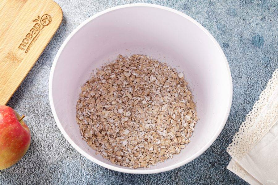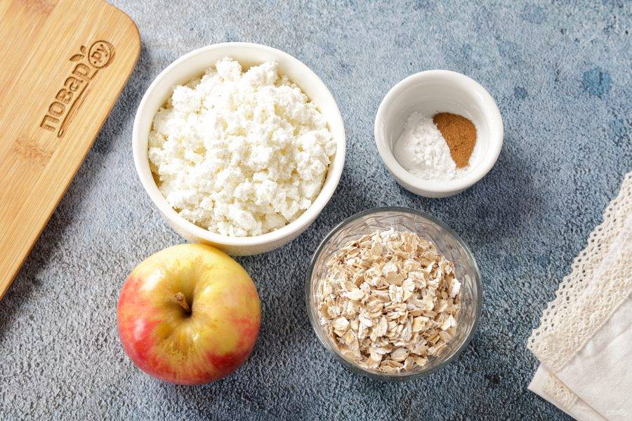 Подготовьте все ингредиенты по списку. Творог можете взять любой жирности. Овсяные хлопья можно заменить на овсяную муку. Яблоко берите сладкое и сочное.