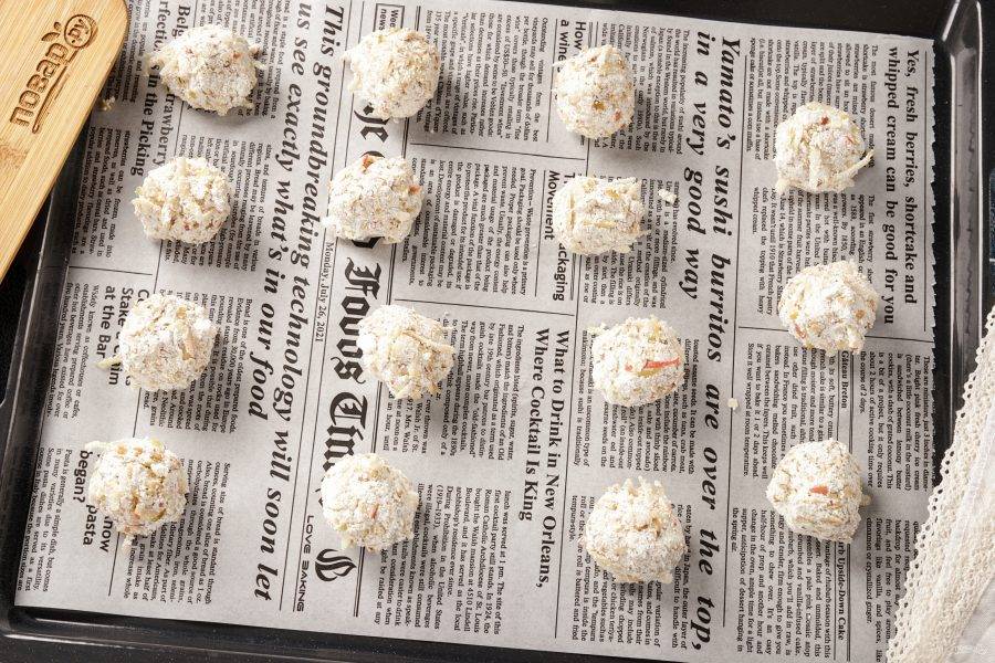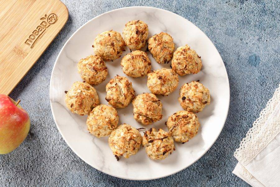 Сформируйте руками небольшие шарики, размером с грецкий орех. Выложите на противень, на некотором расстоянии друг от друга. Противень лучше застелить специальным ковриком или силиконизированным пергаментом. Если у вас обычная пекарская бумага, то лучше смазать её маслом. Выпекайте при 180 градусах 30 минут или до золотистого цвета.