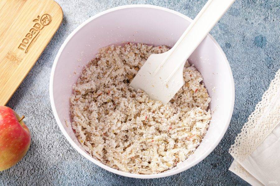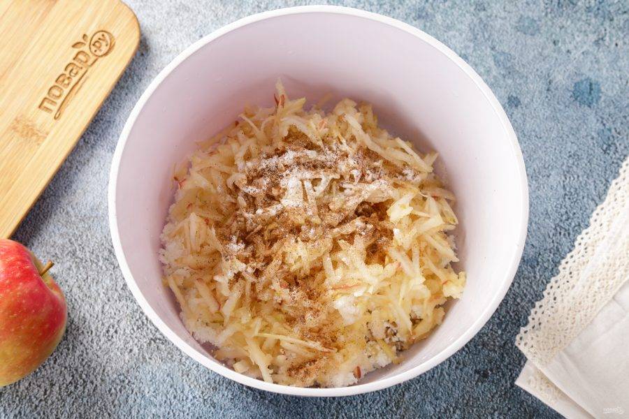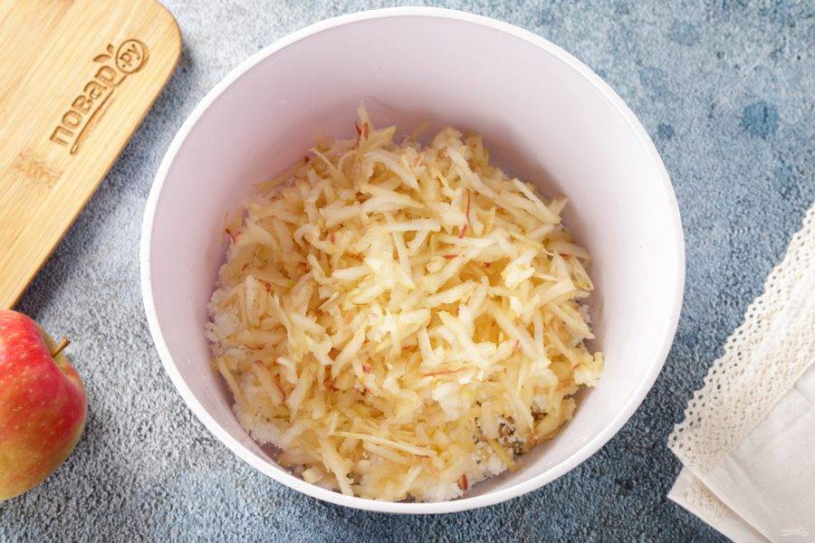 Добавьте тёртое на крупной тёрке яблоко. Я тру прямо со шкуркой.