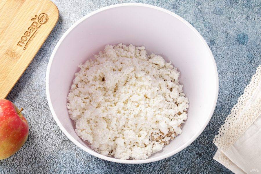 Добавьте творог. Если творог с крупными комочками, то предварительно разотрите его вилкой.