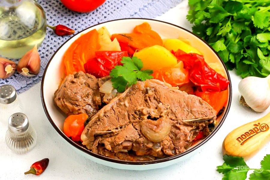 За это время мясо станет очень сочным, ароматным и пропитанными всеми вкусами. Объем блюда уменьшится на треть, овощи выпустят сок.