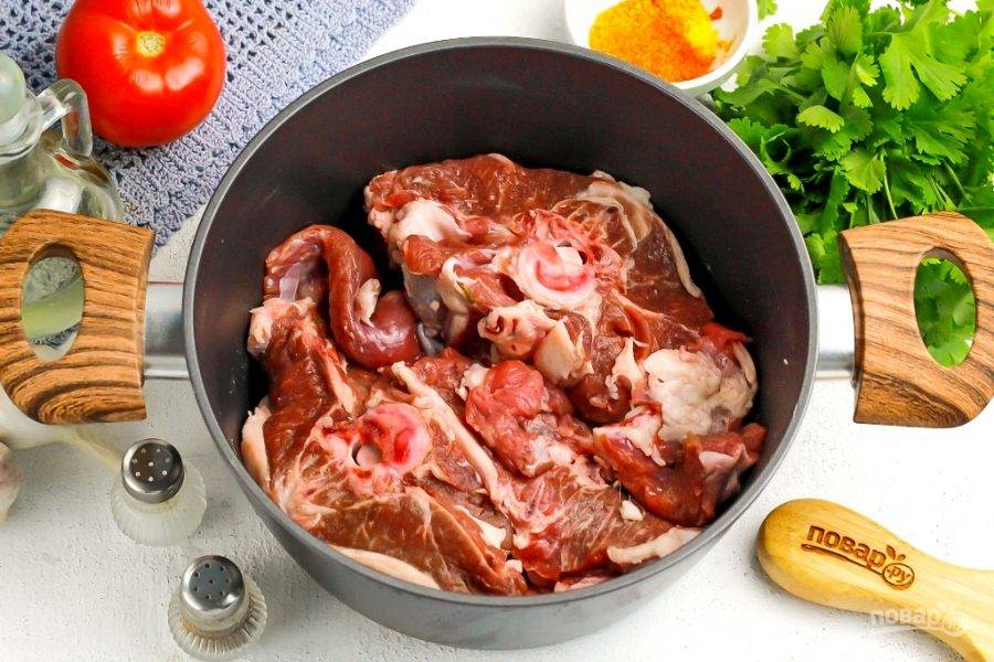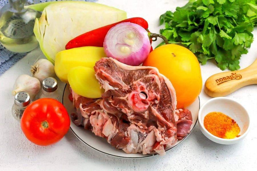 Подготовьте указанные продукты. Овощи очистите и промойте в воде, из баранины вырежьте пленки и жилы.