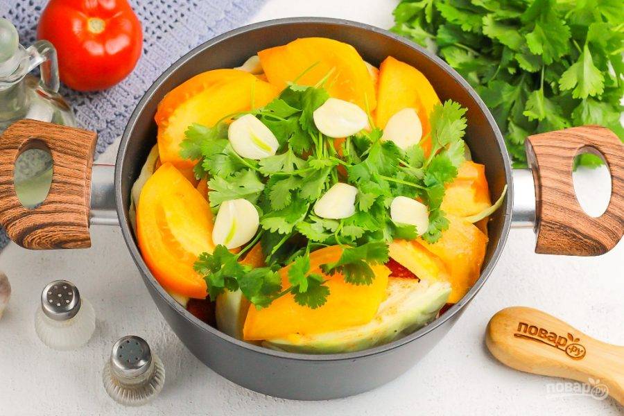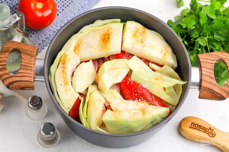 Нарежьте крупными кусками капусту и выложите поверх перца. Снова присыпьте приправой. Все овощи выкладываются ровным слоем.