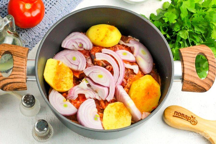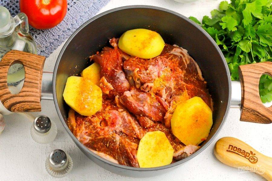 Нарежьте крупными кусочками картофель, добавьте к мясу и всыпьте 1 ст.л. восточной приправы. Вместо нее можно использовать микс приправ и специй по вашему вкусу.