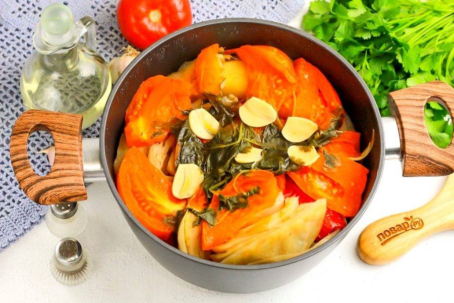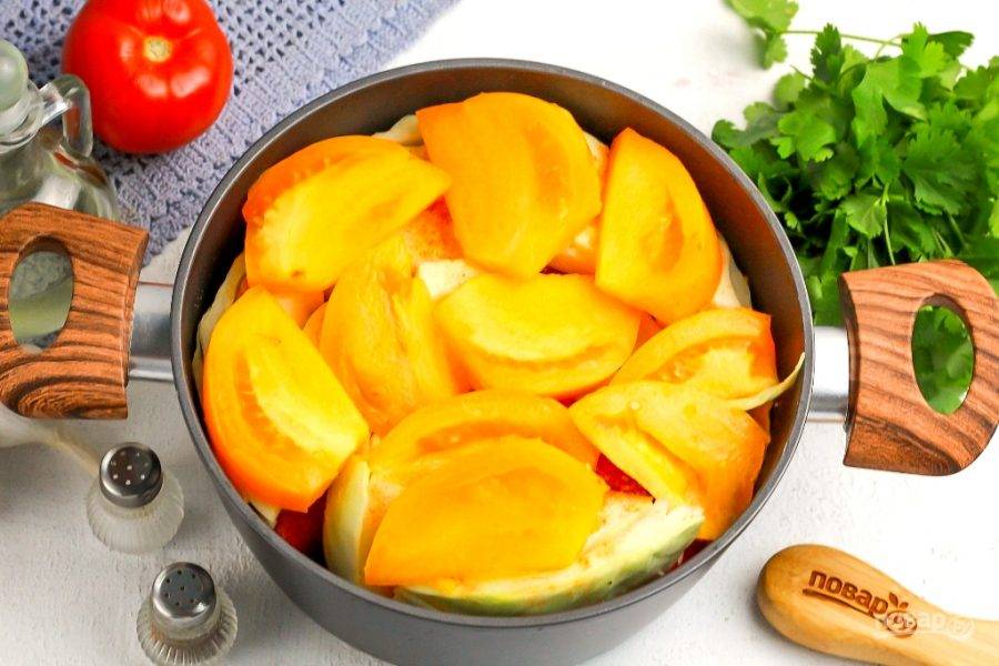 Последними нарежьте крупно помидоры и выложите в емкость до верха. Помидоры выкладываются последними, чтобы их сок стекал и напитывал все остальные овощи.