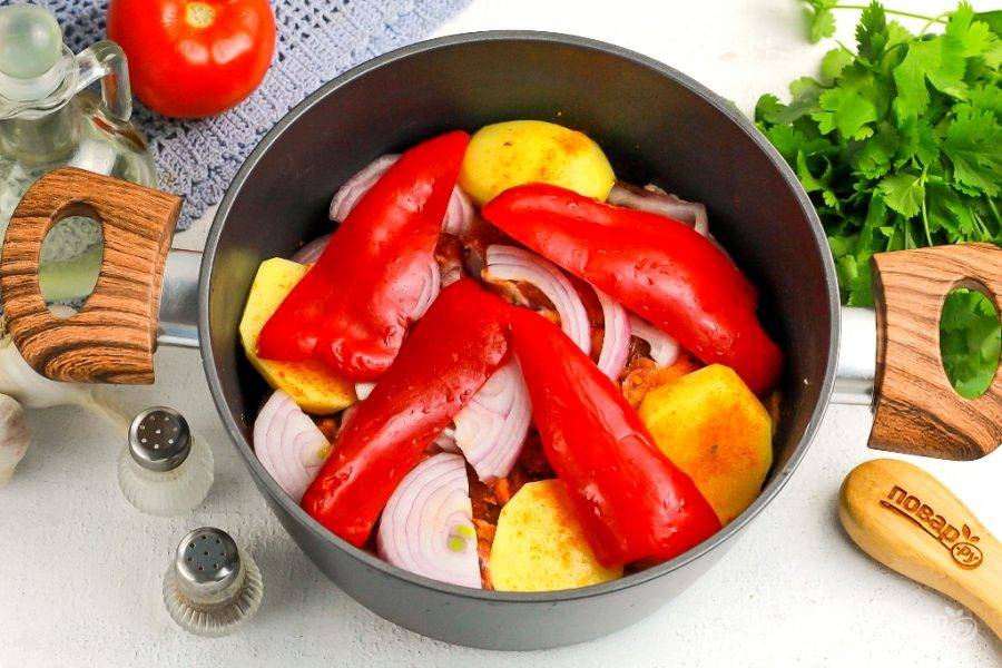 Сверху — четвертинки очищенного красного болгарского перца (паприки). Можно вместо свежего перца использовать измельченную сушеную приправу.