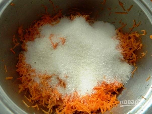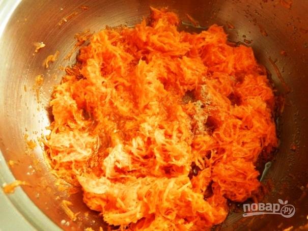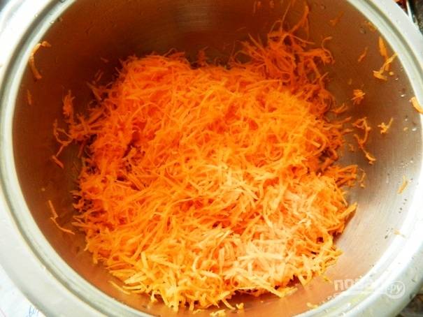1. Морковку необходимо помыть, почистить и натереть на мелкой терке.
