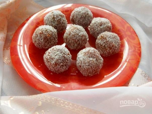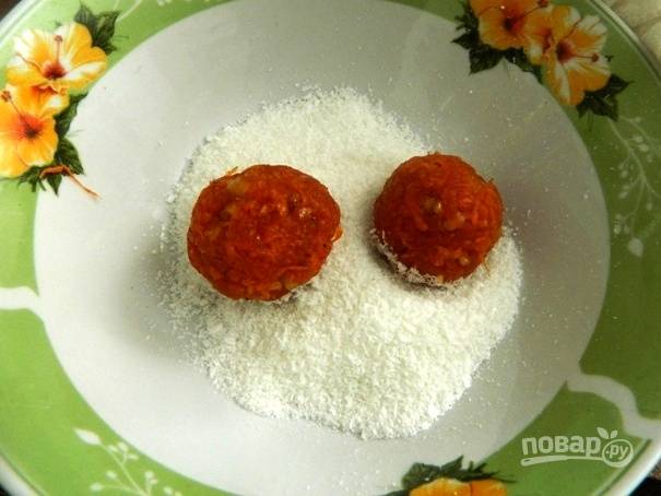 5. Из остывшей морковной массы делаем небольшие шарики, обваливаем их в кокосовой стружке.