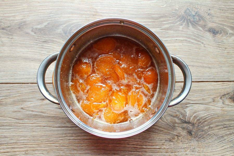 Переложите абрикосы с сиропом в кастрюлю с толстым дном.