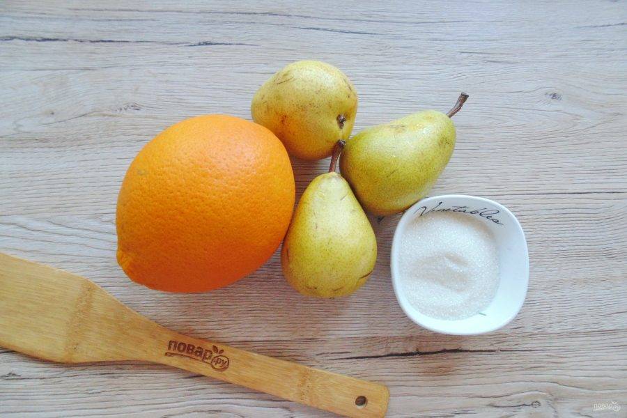 Подготовьте ингредиенты для приготовления джема из груши с апельсином на зиму.