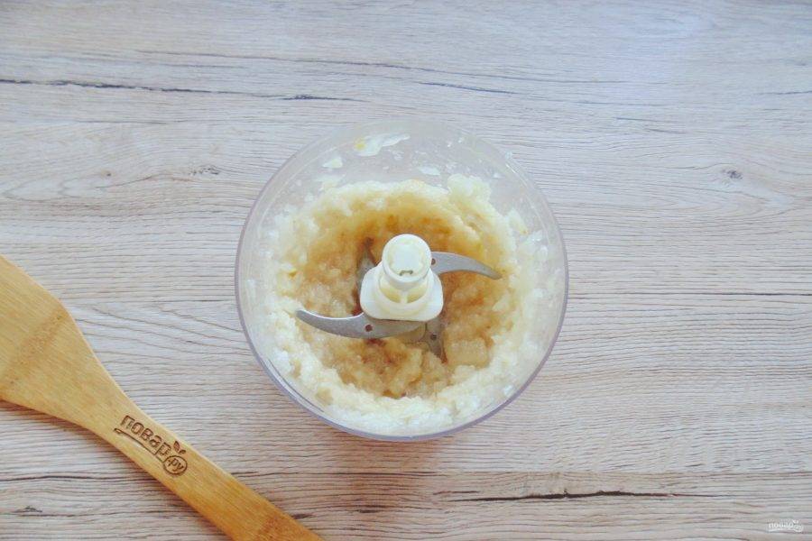 Удалите семенную коробочку и нарежьте груши небольшими кусочками. Переложите в чашу измельчителя. Измельчите груши не полностью — так, чтобы оставались мелкие кусочки мякоти.