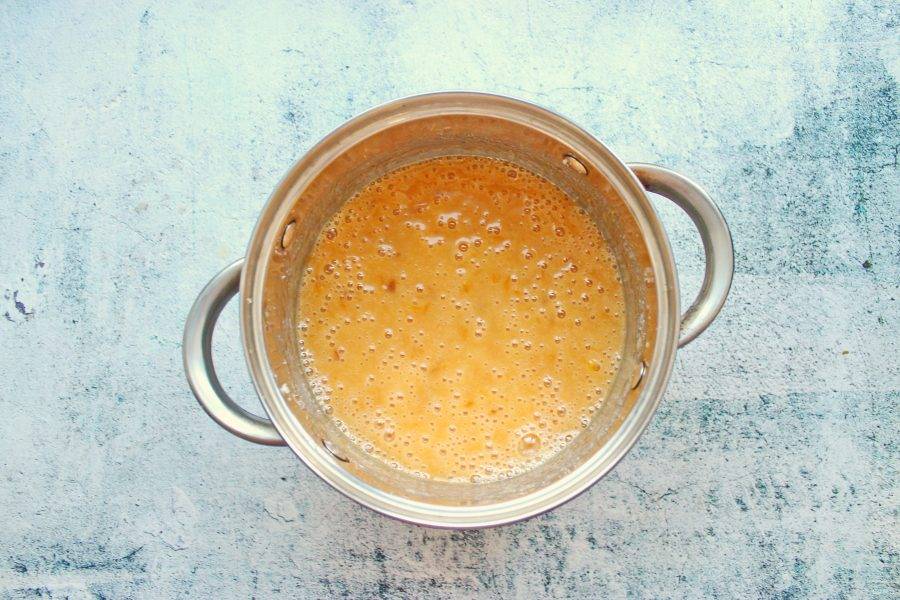 Поставьте кастрюлю на средний огонь и доведите до кипения. Убавьте огонь и варите в течение 10 минут, снимая пену.
