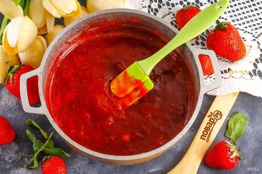 Отварите варенье примерно 10-15 минут, следя за тем, чтобы оно не подгорело. Затем помните ягоды вилкой или прессом для отварного картофеля.