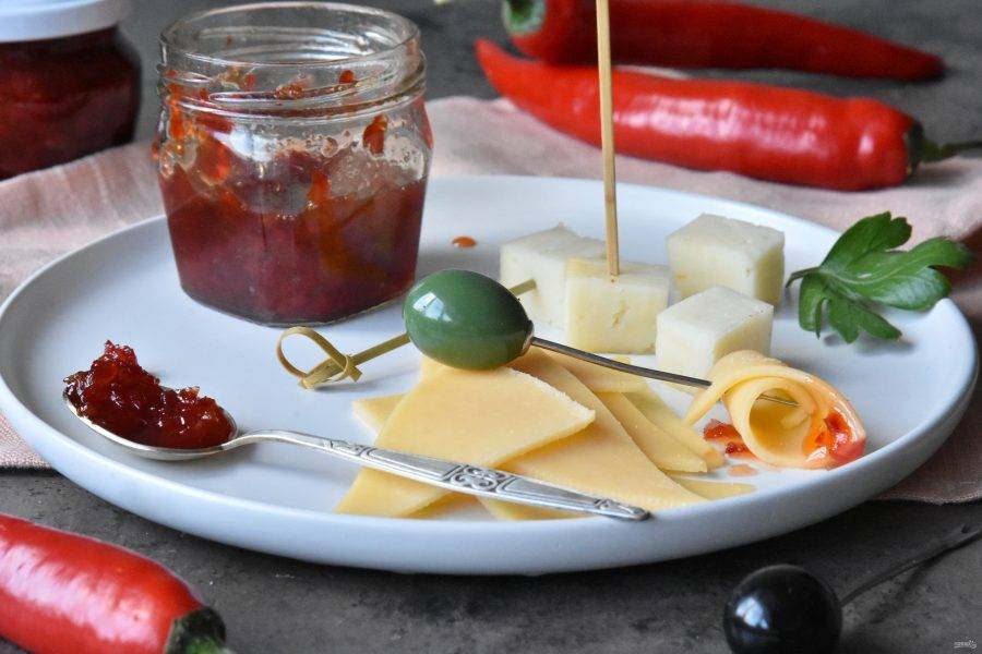 Пикантный джем из чили перца идеально подходит к сырам, мясным нарезкам. Его можно подать как соус к креветкам, овощам и жареному мясу.