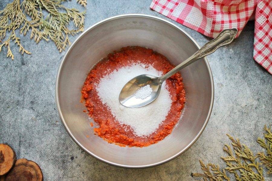 Добавьте в рябиновое пюре сахар, лимонную кислоту и перемешайте.