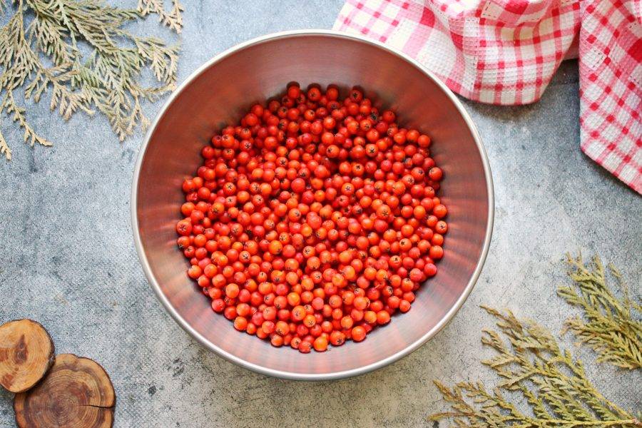Подготовьте все необходимые ингредиенты для приготовления джема из красной рябины. Небольшие банки тщательно вымойте в горячей воде с добавлением соды, сполосните. Стерилизуйте любым удобным способом. Железные крышки прокипятите в течение 7 минут, капроновые крышки пролейте кипятком.