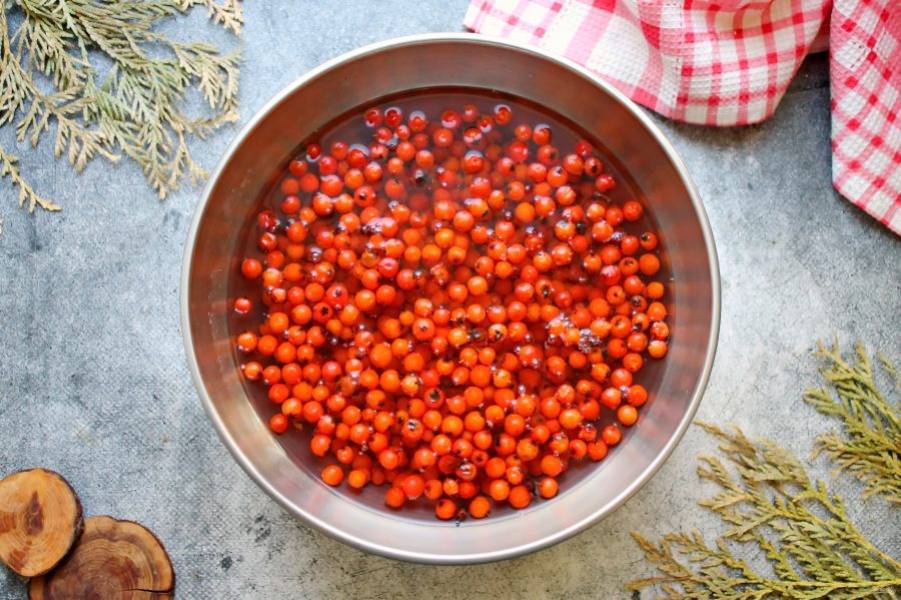 Подготовленную рябину залейте кипятком и оставьте на 5-10 минут под крышкой. Откиньте рябину на сито.