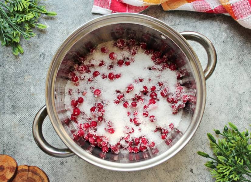 Выложите смородину в кастрюлю с толстым дном, в которой будете варить варенье. Всыпьте сахар, перемешайте и дайте постоять 5-6 часов, чтобы ягоды пустили сок.