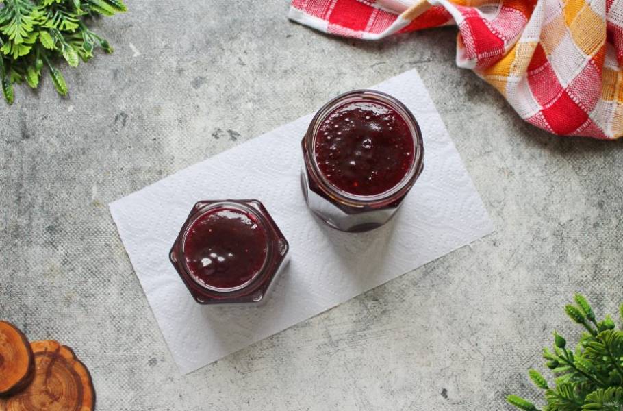 Готовый джем разложите по подготовленным банкам и плотно закройте крышками. Переверните джем вверх дном и дайте постоять 10 минут. После этого верните банки в нормальное положение и полностью остудите. Уберите банки с джемом из красной смородины с пектином на хранение.