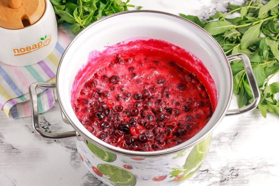 Выключите нагрев и отпюрируйте варенье погружным блендером. Затем снова включите нагрев и на минимальном нагреве проварите джем примерно 5-7 минут. За это время ошпарьте банки и крышки кипятком или простерилизуйте любым другим образом. Следите, чтобы джем не подгорел.