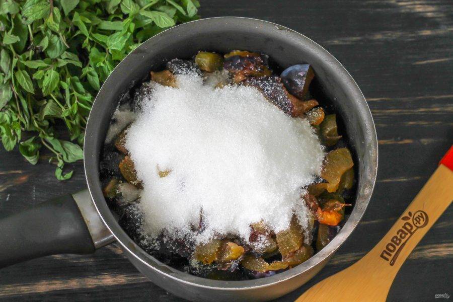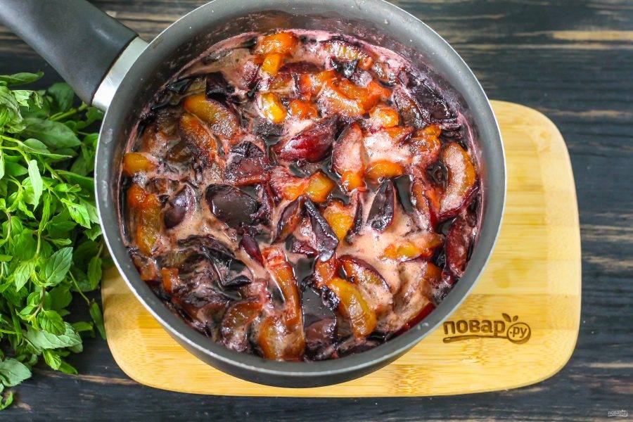 Всыпьте сахарный песок и тщательно вмешайте его в сливовую массу. Оставьте на 10-15 минут, чтобы выделился сок. Добавьте лимонную кислоту и поместите емкость на плиту, включая умеренный нагрев.
