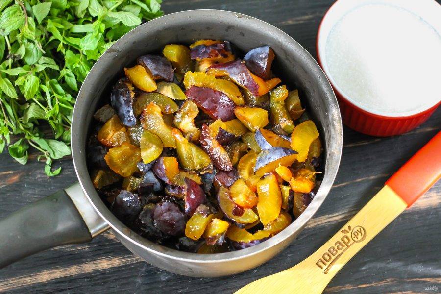 Нарежьте сливовую мякоть кусочками прямо в казан или ковш с антипригарным дном. Чем мельче будет нарезка, тем быстрее сварится джем.