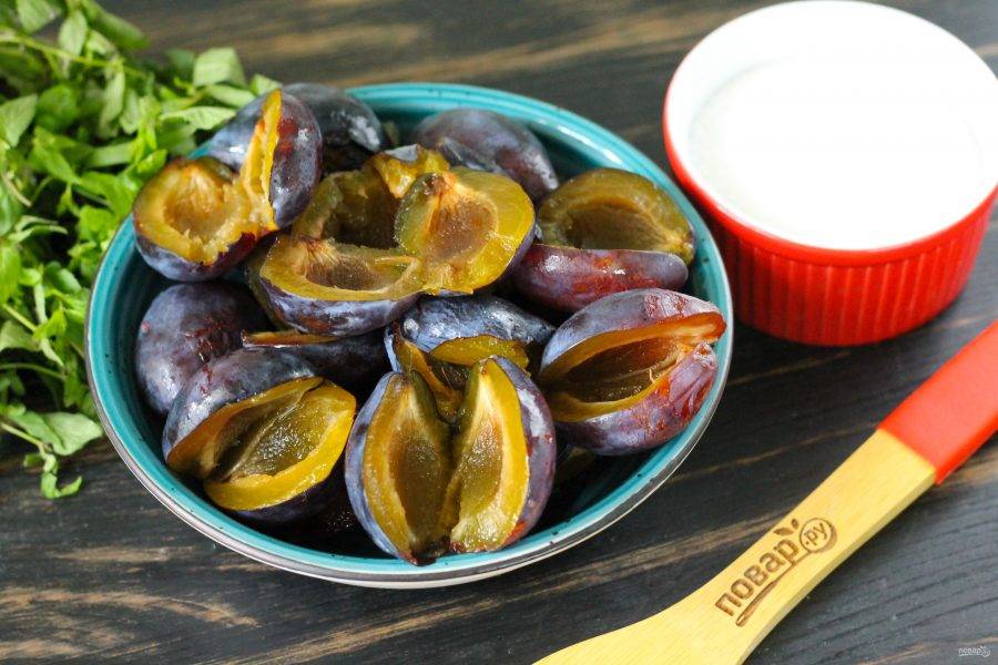 Сливы тщательно промойте в воде, располовиньте их и удалите косточки.