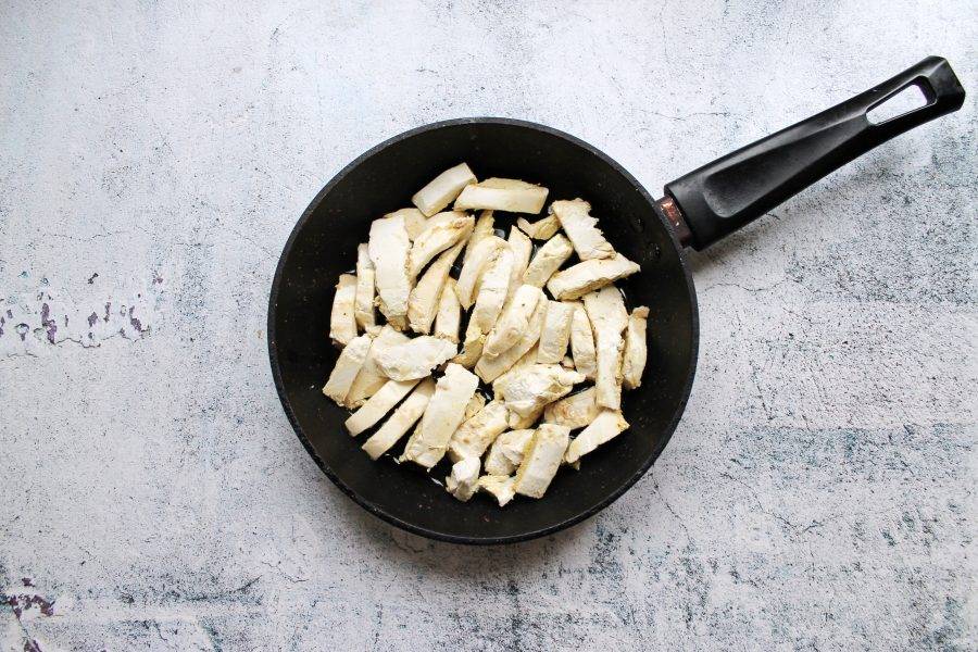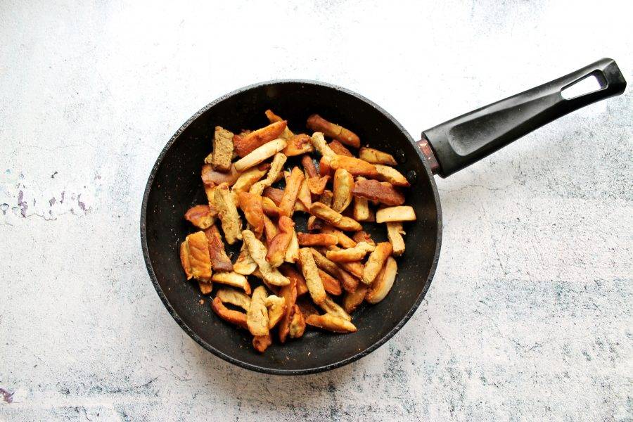 Гриб сполосните и очистите их от верхнего слоя. Порежьте белую мякоть средней соломкой. В сковороду налейте растительное масло, выложите грибы.
