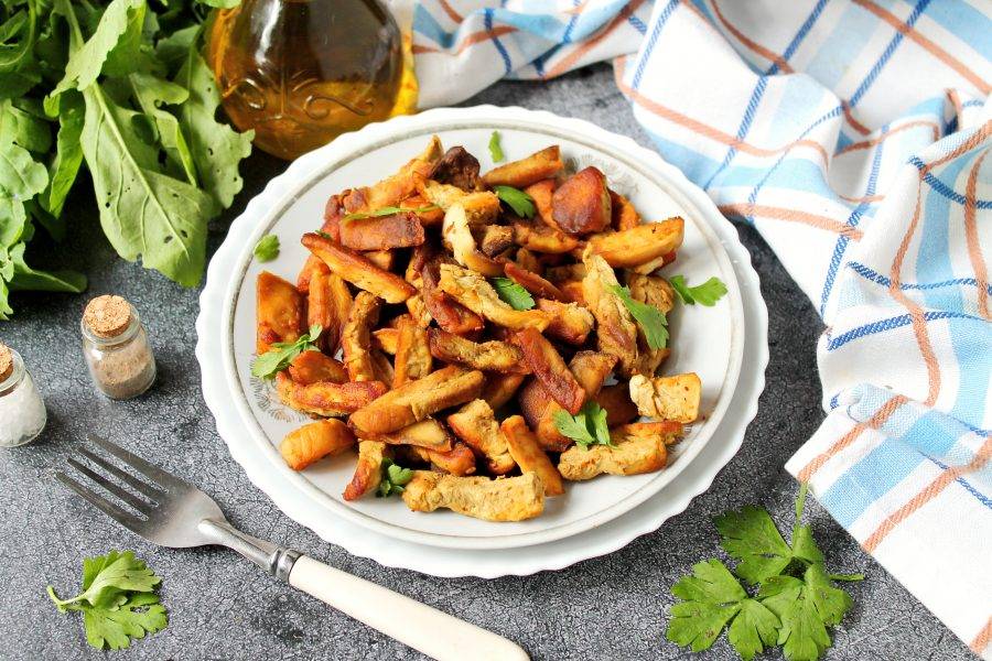 Это великолепное блюдо, в котором сочетаются жареные грибы и отваренные баклажаны. Его можно подавать на праздничный стол как закуску, а в обычный день это вполне самостоятельное сытное блюдо.