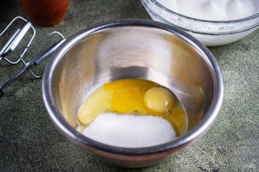 Яйца аккуратно разделите на белки и желтки по двум чистым, сухим мисочкам.