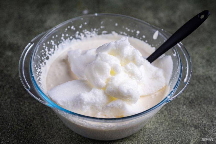 И лопаткой аккуратно вмешайте белки до полного соединения с основной сливочной смесью.
