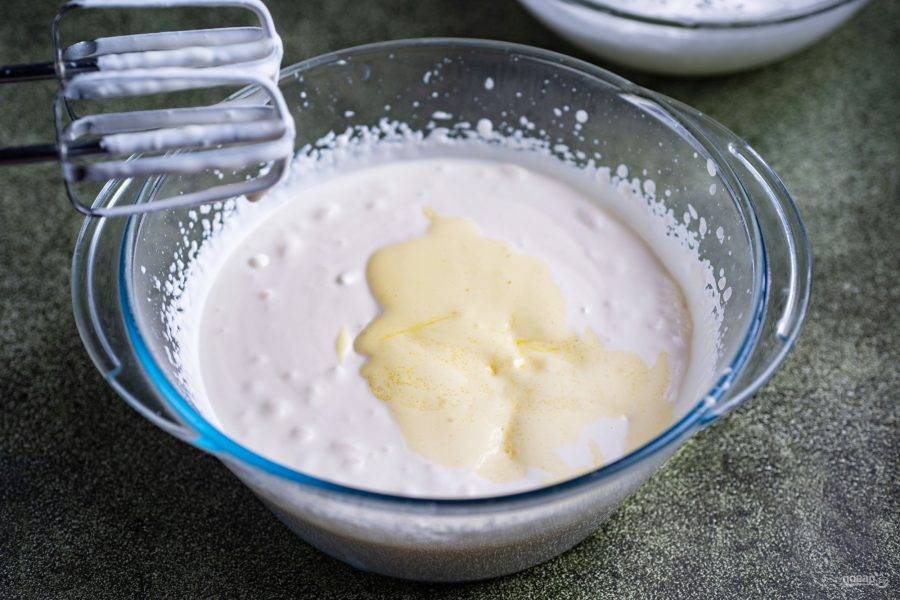 Миксером на небольшой скорости вмешайте желтковую смесь во взбитые сливки.